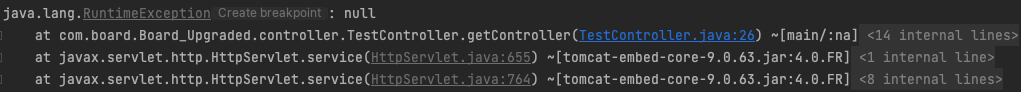 이 상태에서, 실행을 시키고 해당 컨트롤러 uri를 요청하면, 자바 프로젝트에서 예외가 발생할 것이다.