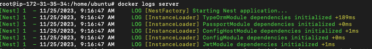 이런식으로 명령을 넣어주었고, 이후에 실행 상태는 docker logs server로 볼 수 있다.