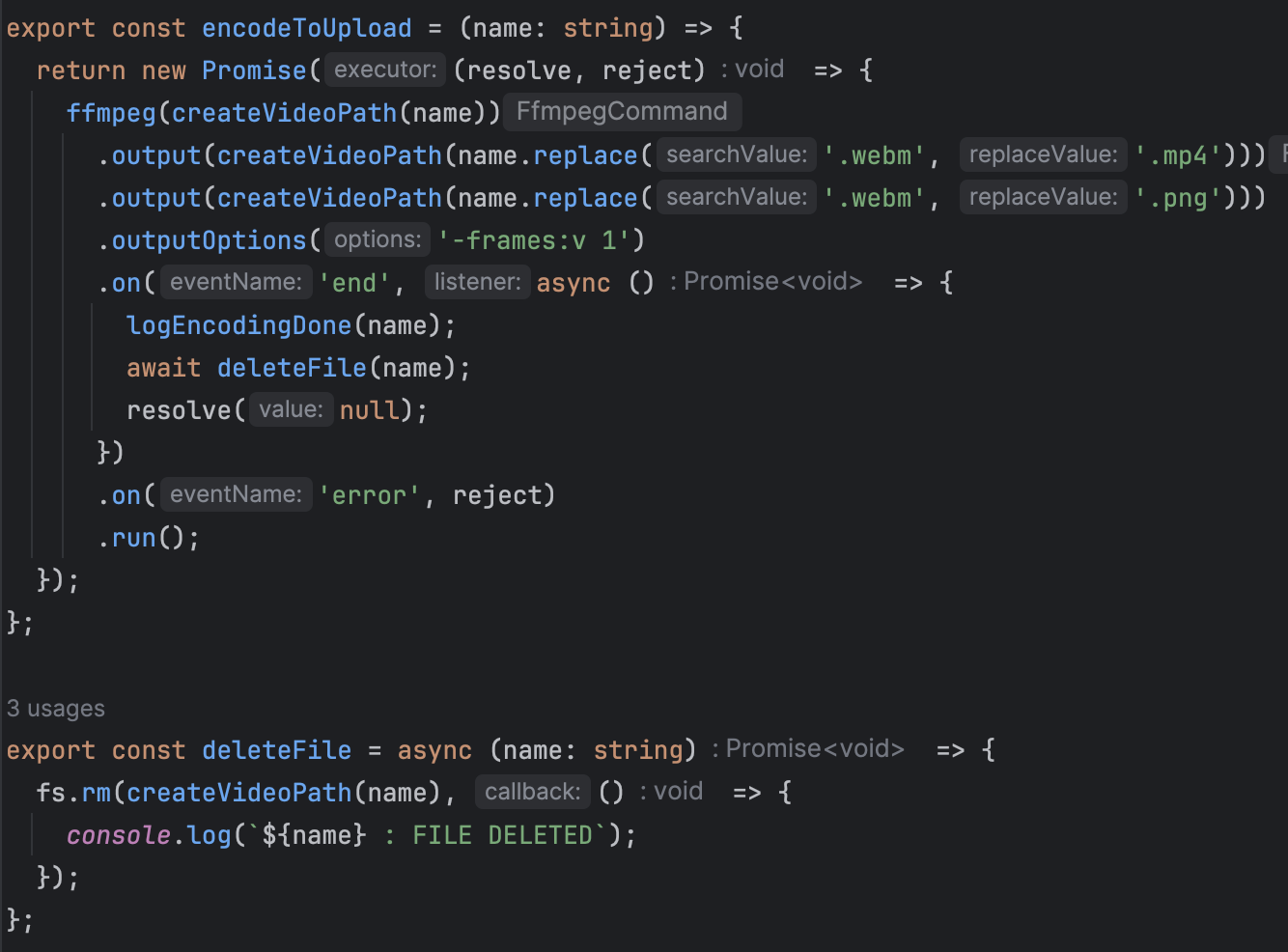 이후에 영상을 fluent-ffmpeg를 통해 인코딩해 저장하게했다.
