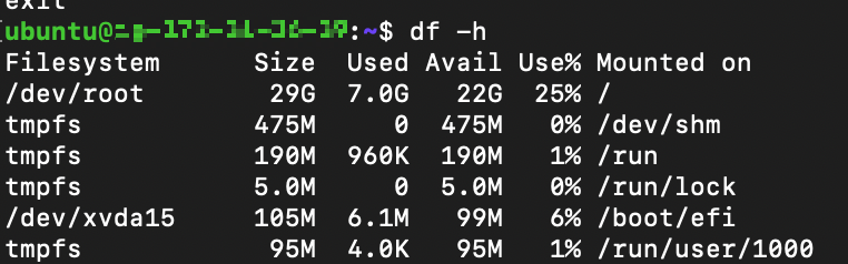 이렇게 내 EC2 인스턴스의 사양을 확인했다. 현재 빈 공간이 22GB가 존재한다.