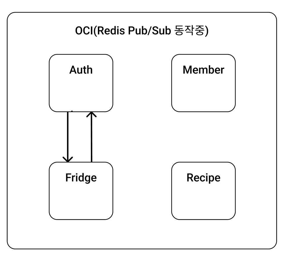 Redis 또한 현재 OCI 인스턴스 안에서 동작하고 있기 때문에, OCI 인스턴스에 Auth와 Fridge만을 동작시키고, Member와 Recipe를 다른 모듈로 두면 될 것 같다는 생각이 들었다.