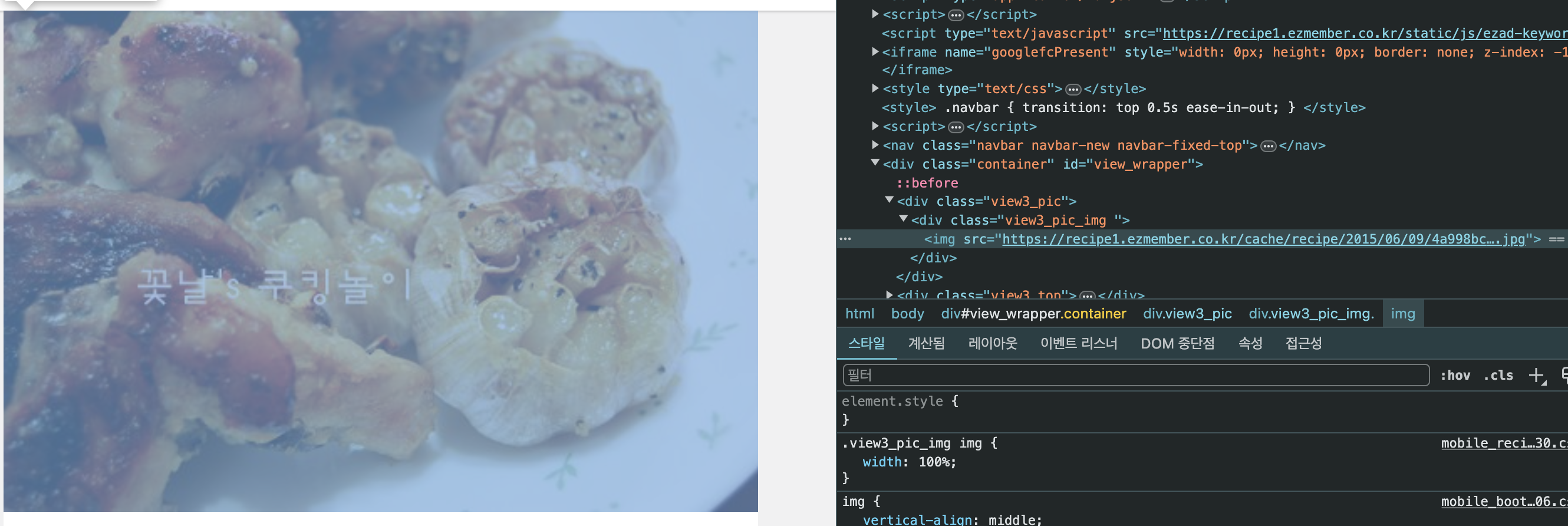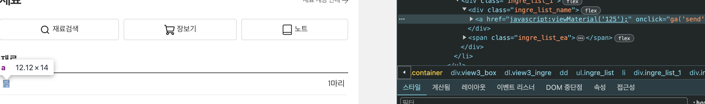 그래서 만개의 레시피의 화면을 개발자도구로 띄워보았다.