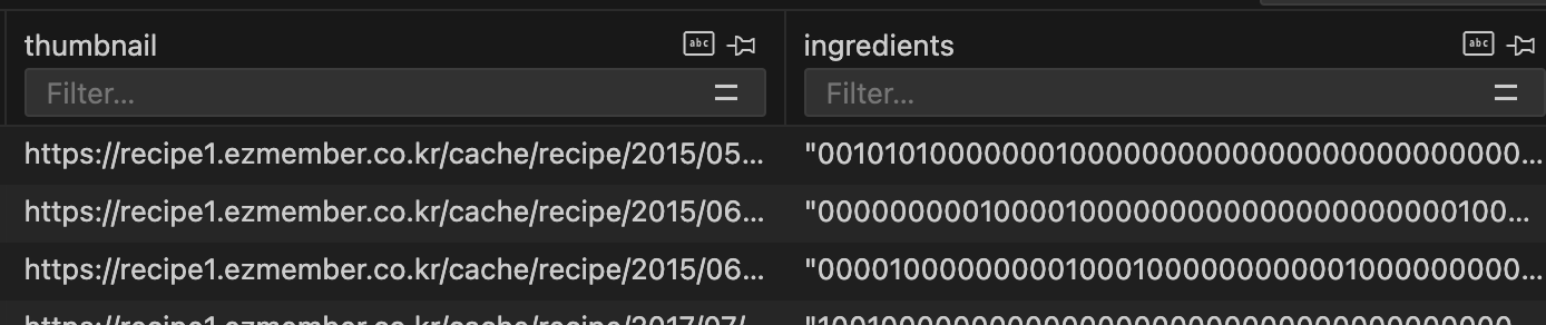 일단 재료들이 제 1정규형의 구조도 가지지 못한, 속성값을 문자열로 둔 ','로 연결된 재료들의 문자열 컬럼이 존재했던 것이다.