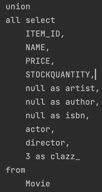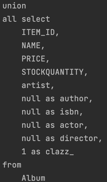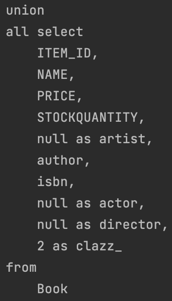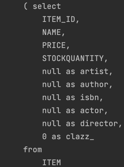 이런 식으로 모든 종류의 상속받는 객체들을 다 뒤져서 Item을 검색한다. 결국 Item 내에서만 찾는게 아니라, 다른 테이블을 다시 다 합쳐서 검색을 한다는 것이다.