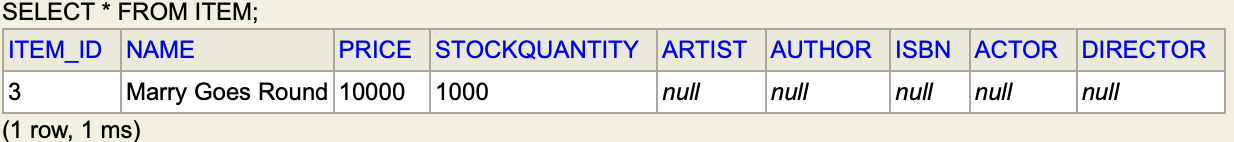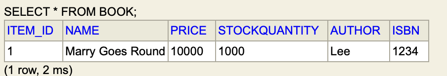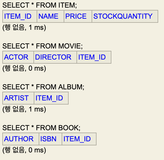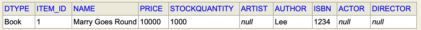 이런식으로 ITEM에 있어야 하는 속성인 가격, 수량, ID, 이름이 BOOK 테이블의 속성들과 같이 Book 테이블에 들어간다.