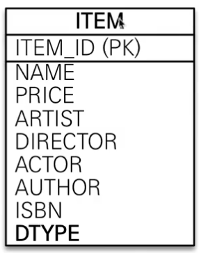 운영상 단일테이블에서는 DTYPE이 없으면 지금 들어가 있는 데이터가 책인지, 영화인지, 음반인지 알 수 없다.