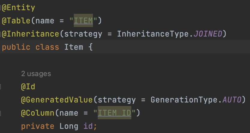 그렇기에 DTYPE을 만들어주어야 하는데, 이 때 Item 클래스에 DiscriminatorColumn 어노테이션을 넣어준다. 그러면