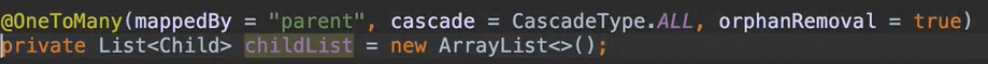 이렇게 했을 때의 장점 : 원래 연관관계에서 컬렉션에서 인스턴스의 Child를 삭제해도 해당 엔티티는 데이터베이스에서 삭제되지 않는다.