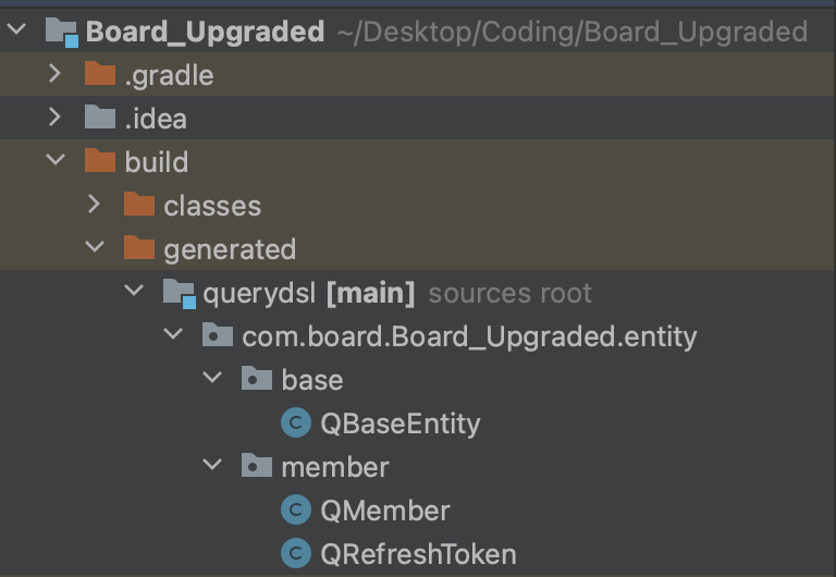 그러면 이렇게, querydslDir에 작성한 주소에 엔티티의 이름에 Q가 들어있는, queryDsl용 클래스들이 생성된다.