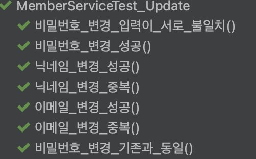 이렇게 총 3가지의 수정 메서드와, 각 메서드당 2(비밀번호는 3)가지 경우가 생기게 된다.