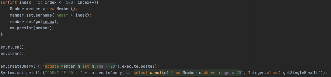 이런식으로 나이를 1~100으로 만들어둔 후, 모든 멤버의 나이를 20으로 update시키는 쿼리문을 날렸다. (벌크 연산)