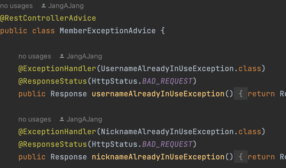 캡스톤을 하다가, 한 동기가 질문했던 부분을 블로그에 남겨보기로 했다. 일단 받은 질문을 간단하게 요약하자면, 스프링은 자바로 동작한다. 자바에서는 에러가 발생하면, RuntimeException(이놈 말고도, IllegalArgumentException처럼 extends RuntimeException을 받는 녀석들이 있다)으로 발생하는 예외들은 분명 러닝과정에서 빨갛게 예외가 발생했다고 뜬다. 근데 이렇게, Response를 이용해 Exception에 대해 뭐시기를 해주는게 의미가 있는가? 였다. 일단, 이러한 유튭..아니 블로그각을 만들어준 동기에게 감사하고 정리를 조금 해봐야겠다. 테스트를 위해 하나의 예외를 집어넣어 실행을 시켜보았다. 이 상태에서, 실행을 시키고 해당 컨트롤러 uri를 요청하면,..